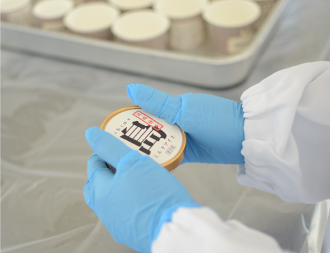 異物を確認しながら、蓋とカップの向きを揃えて、冷凍、全国各地へ出荷いたします。